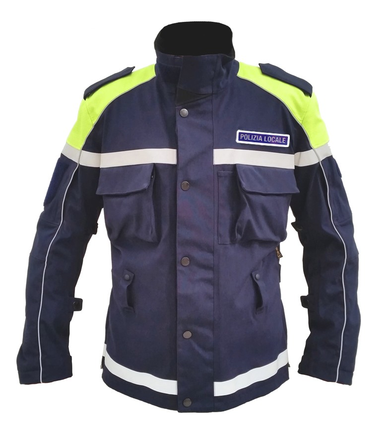 Stampa transfer rifrangente “Polizia Locale” o “Polizia Municipale” sulla schiena ed etichetta “Polizia Locale” o “Polizia Municipale” sul davanti sinistro.